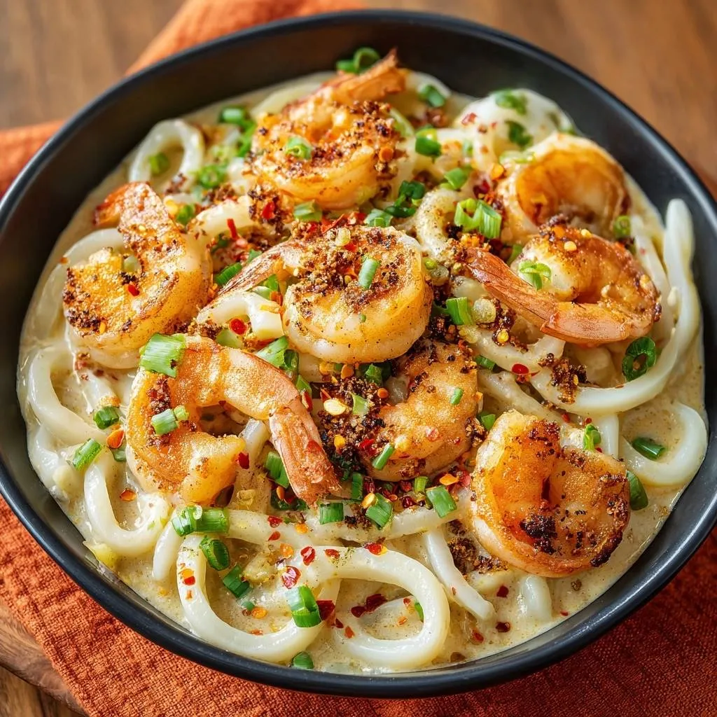 Plump, tender shrimp and squid in a creamy coconut sauce with udon noodles, crispy garlic, and spicy chilies. High-heat sear technique guarantees no rubbery seafood.