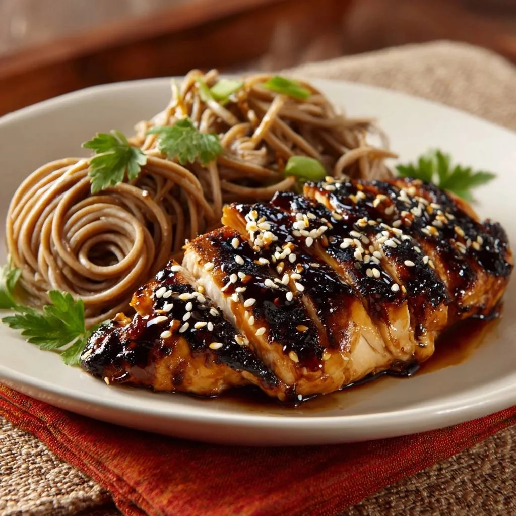 Juicy teriyaki glazed chicken with soba noodles. Pounding chicken ensures even cooking for tender, flavorful results every time.