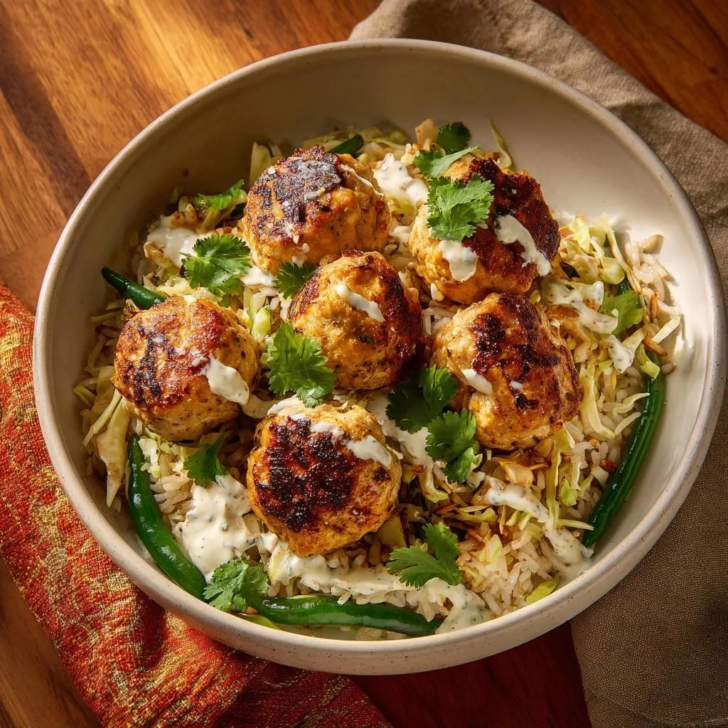 Juicy, crispy chicken meatballs made with ground chicken thigh, served over stir-fried cabbage rice and topped with spicy chili yogurt sauce. Foolproof method for restaurant-quality results.