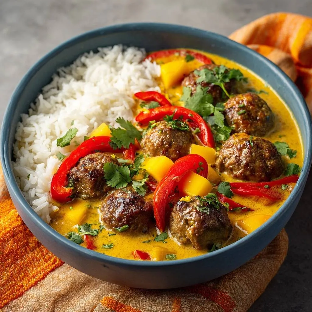 Juicy seared meatballs simmered in a creamy mango curry sauce with coconut milk and bell peppers, served over rice for a tender, flavorful meal.