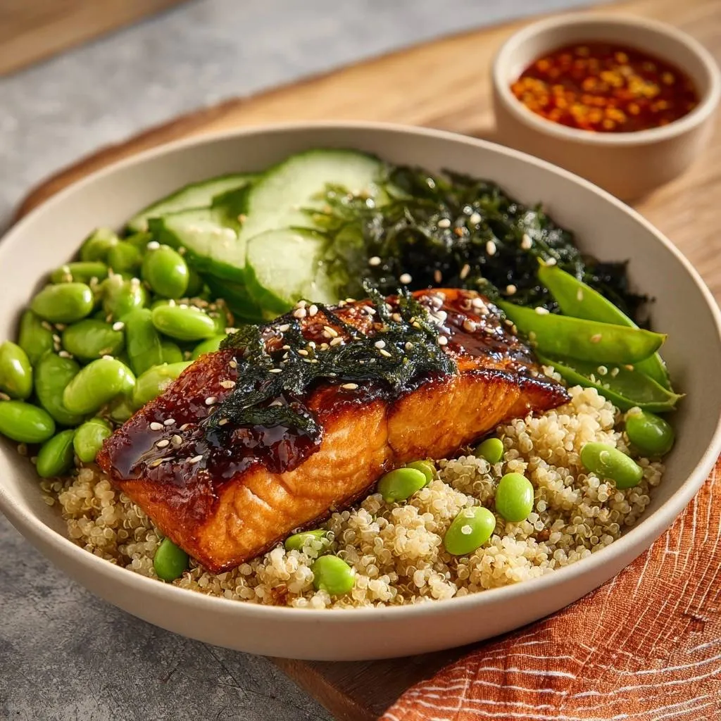 Foolproof low-slow baked teriyaki salmon with caramelizing glaze over fluffy quinoa, edamame, and crisp veggies for a moist, flavorful bowl.