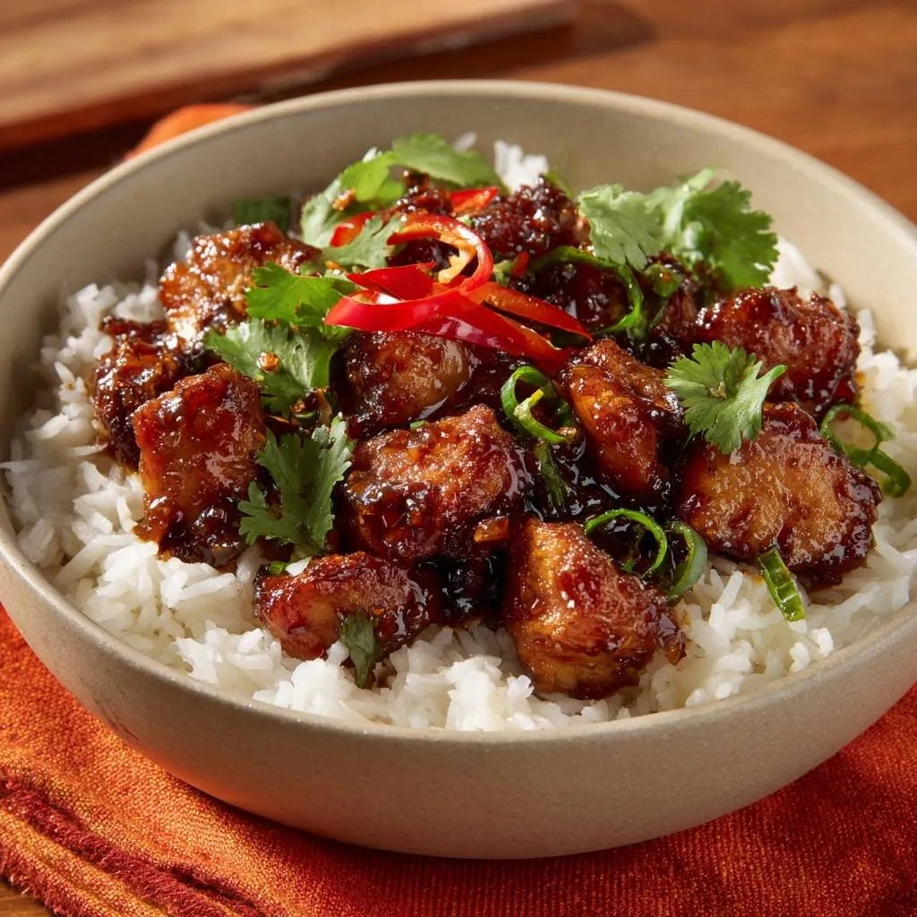 Foolproof sticky chili chicken rice bowl with glossy, clingy sauce using cornstarch slurry—no more watery mess. Crispy chicken, perfect takeout-style.