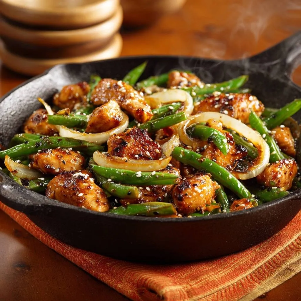 Juicy sesame chicken with crisp green beans and onions in a glossy honey-soy glaze. High-heat sear locks in tenderness—no more dry chicken!