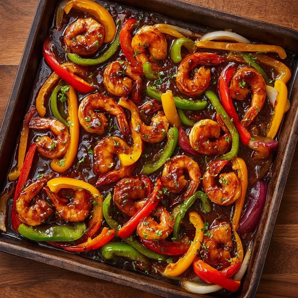 Juicy, glazed shrimp with caramelized peppers on a sheet pan. Pat shrimp dry and add at the end for tender, non-rubbery results in under 30 minutes.