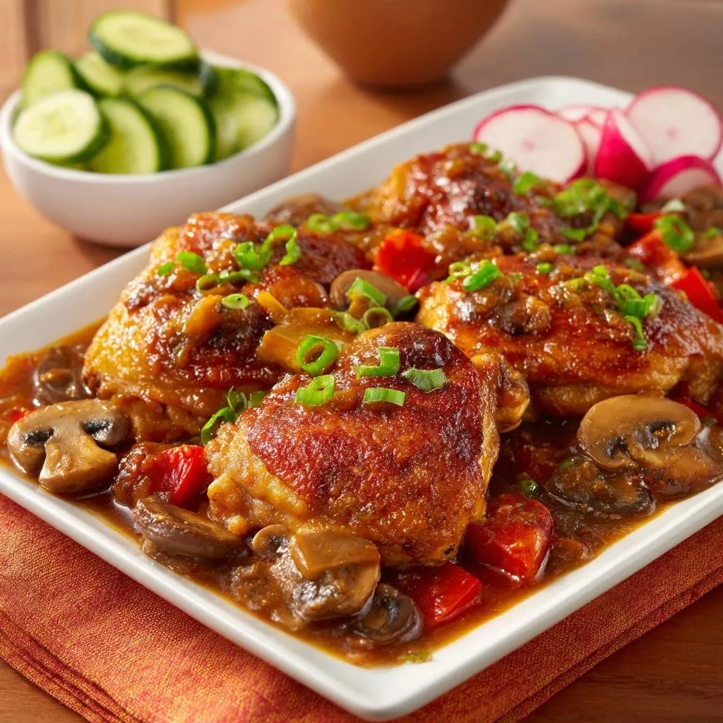 Crispy chicken thighs in a glossy, clingy glaze with mushrooms and peppers—no watery sauce thanks to a simple cornstarch slurry.