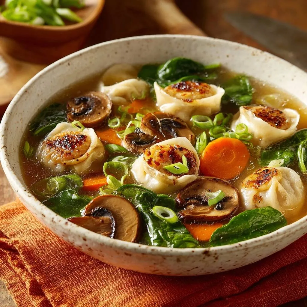 Pan-seared dumplings in a flavorful vegetable broth with spinach, mushrooms, and carrots. Crispy texture that stays perfect—no more soggy dumplings!
