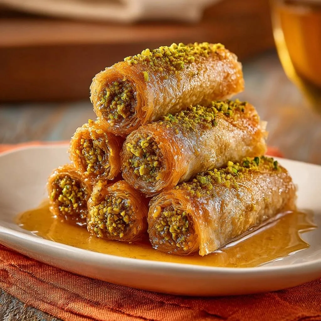 Crispy pistachio kataifi rolls that stay crunchy with ice-cold syrup poured over hot rolls. Perfect no-soggy dessert!