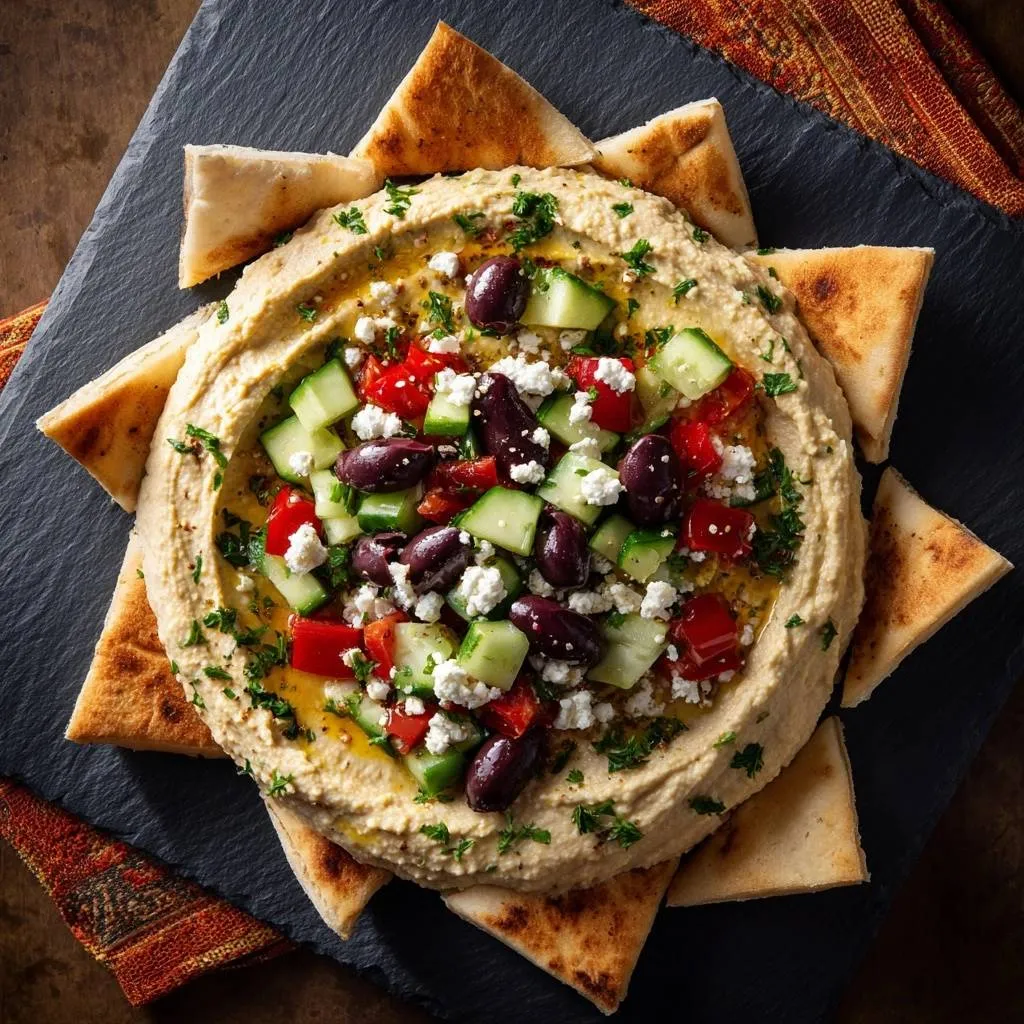 Ultra-creamy homemade hummus with removed chickpea skins, topped with cucumber, tomatoes, olives, feta, and parsley. Perfect party platter served with pita wedges.