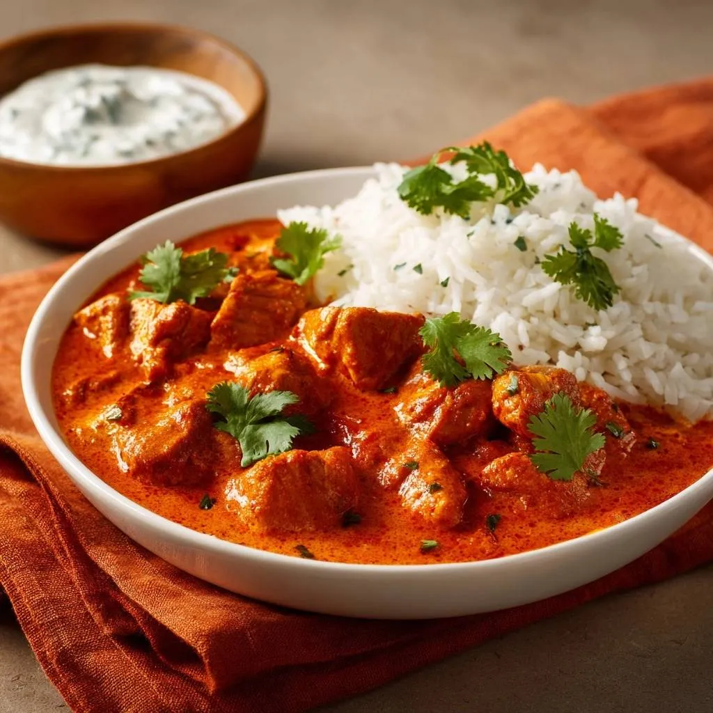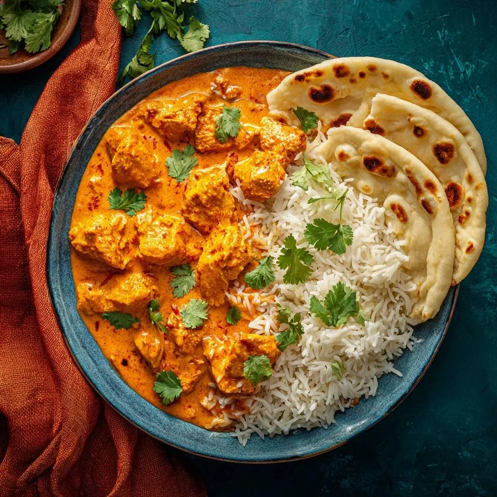 Tender, juicy butter chicken in a creamy tomato sauce, marinated with yogurt for unbeatable moisture. Served with fluffy basmati rice and warm naan.