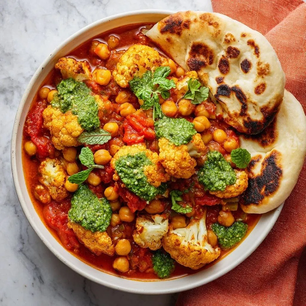 Crispy roasted cauliflower and chickpeas in a thick tomato curry sauce, topped with fresh green chutney and served with naan. No mushy cauliflower here!