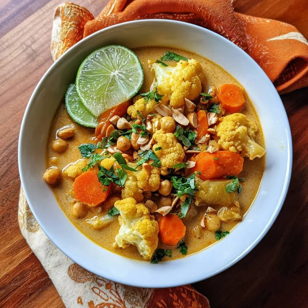Creamy cauliflower chickpea curry with tender-crisp florets, chickpeas, carrots, and coconut milk. Perfectly spiced and frustration-free with an easy timing trick.