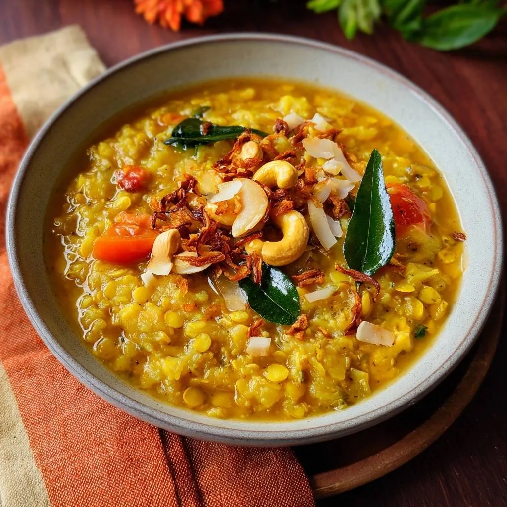 Creamy yellow split lentil dal topped with crispy golden onions, cashews, and curry leaves using a foolproof low-heat tempering method to prevent scorching.