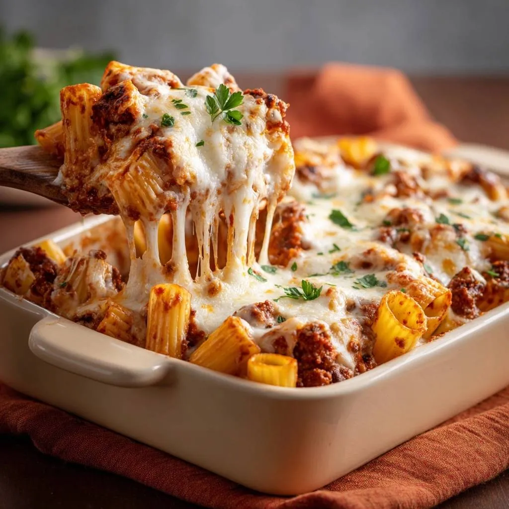 Say goodbye to dry baked pasta with this cheesy beef rigatoni recipe. Par-cook pasta, toss with hot meat sauce, and bake covered for pull-apart cheesy perfection.