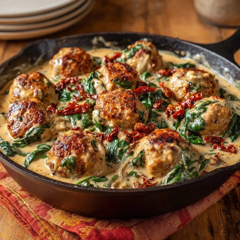 Learn how to make juicy, tender chicken meatballs in a rich Tuscan cream sauce with sun-dried tomatoes and spinach. A foolproof recipe that prevents dry or rubbery meat.