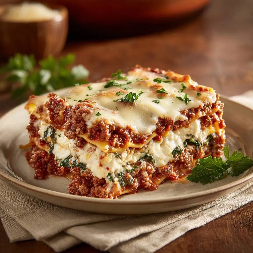 Perfect firm lasagna layers with a simple ricotta-draining trick to prevent watery slices. Restaurant-style beef lasagna at home.