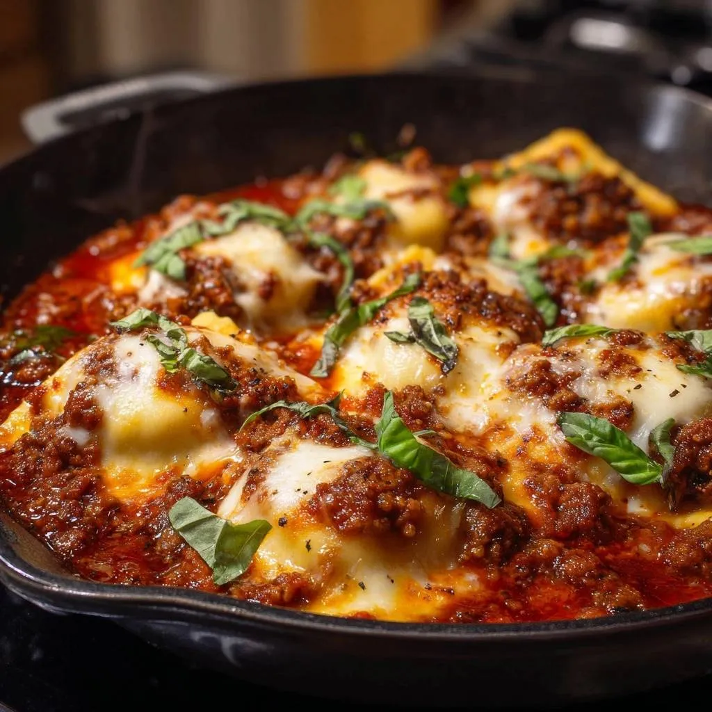 One-skillet cheesy ravioli with meaty ragu: fresh ravioli cooks perfectly al dente in the sauce, no boiling needed. Quick, easy dinner with crispy edges and melty mozzarella.