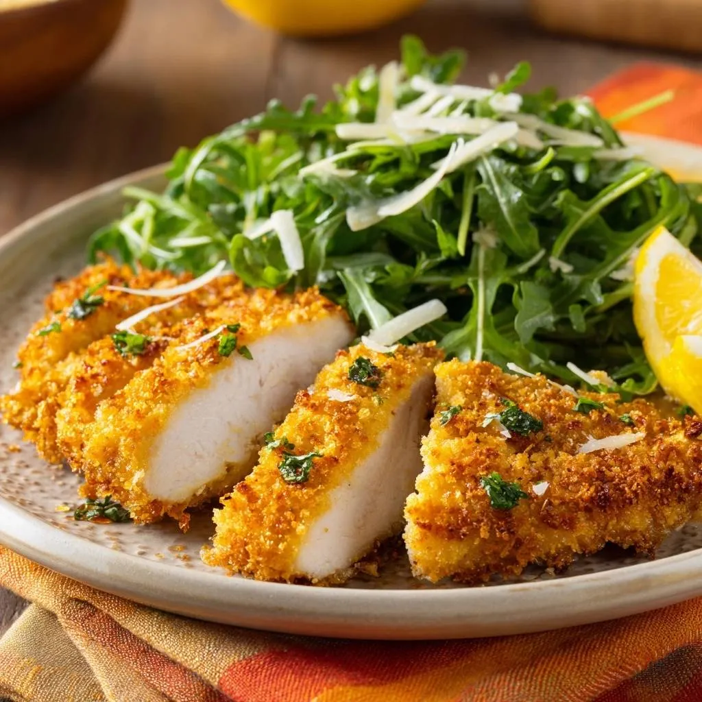 Ultra-crispy panko-breaded chicken breasts fried to perfection, served with a fresh lemon arugula salad. No more soggy breading!
