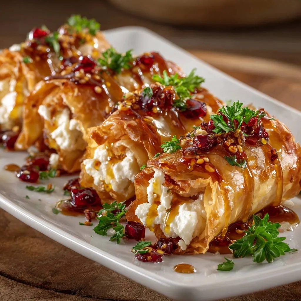 Ultra-crispy feta phyllo rolls with honey drizzle, pomegranate seeds, and sesame crunch. Foolproof butter-brushing technique prevents soggy phyllo for perfect flaky texture every time.