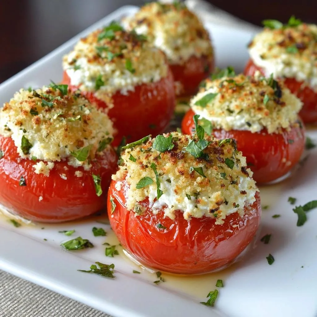 Foolproof crispy feta stuffed tomatoes with a draining method to prevent soggy filling and golden breadcrumb topping.
