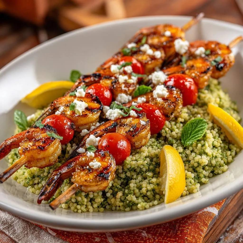 Juicy grilled shrimp skewers with charred tomatoes, feta, and pesto couscous. Perfect high-heat grilling technique prevents rubbery shrimp for a fresh Mediterranean meal.