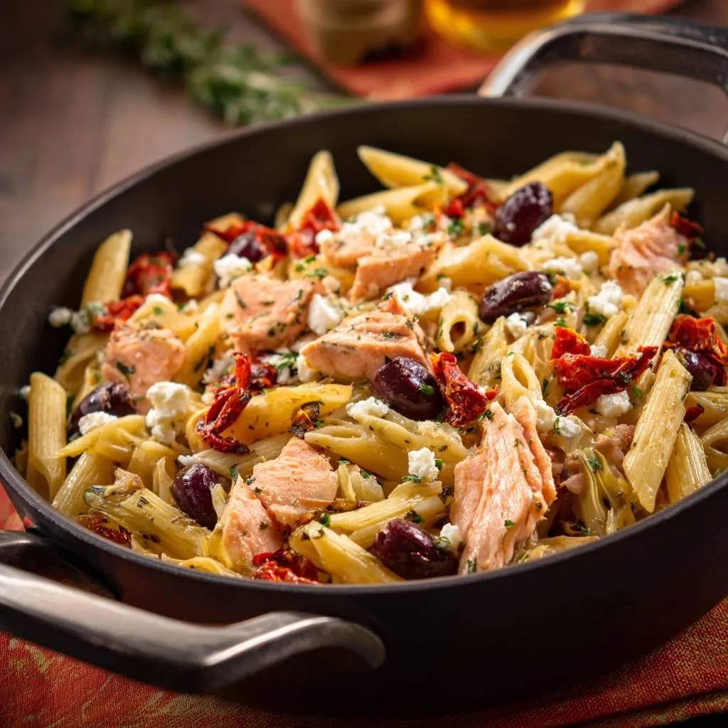 A foolproof Mediterranean salmon pasta recipe featuring sun-dried tomatoes, olives, and feta, using a specific technique to ensure perfectly moist, flakey fish.