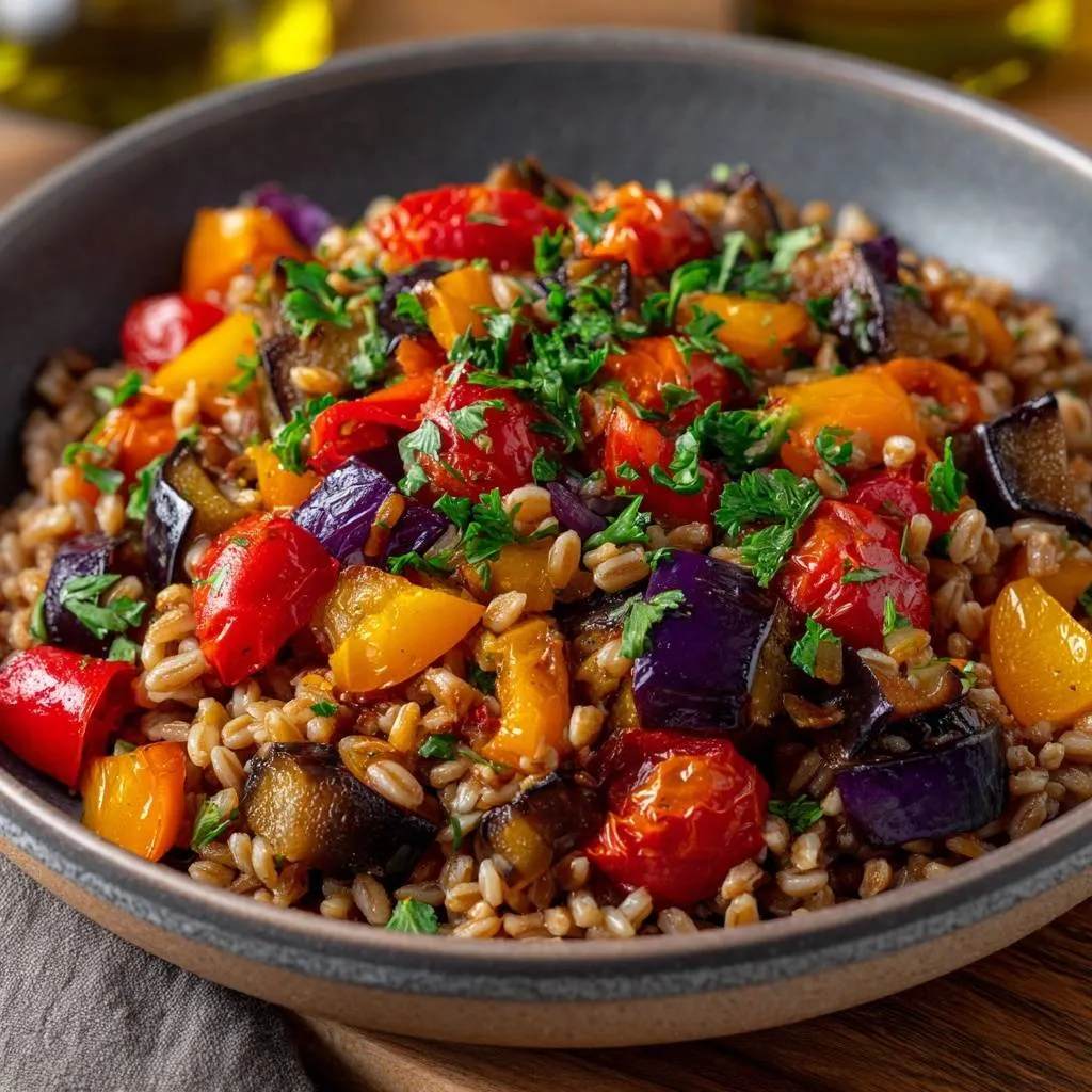 Learn how to make a perfectly textured Mediterranean Farro Bowl with roasted vegetables using a unique toasting method to prevent mushy grains.