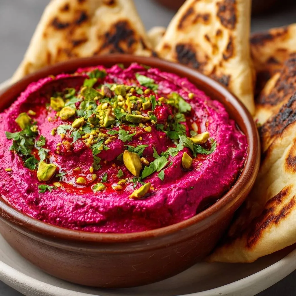 Silky smooth beet hummus with roasted beets, pistachios, and a chickpea skin removal trick for perfect texture. Ideal party dip with naan.