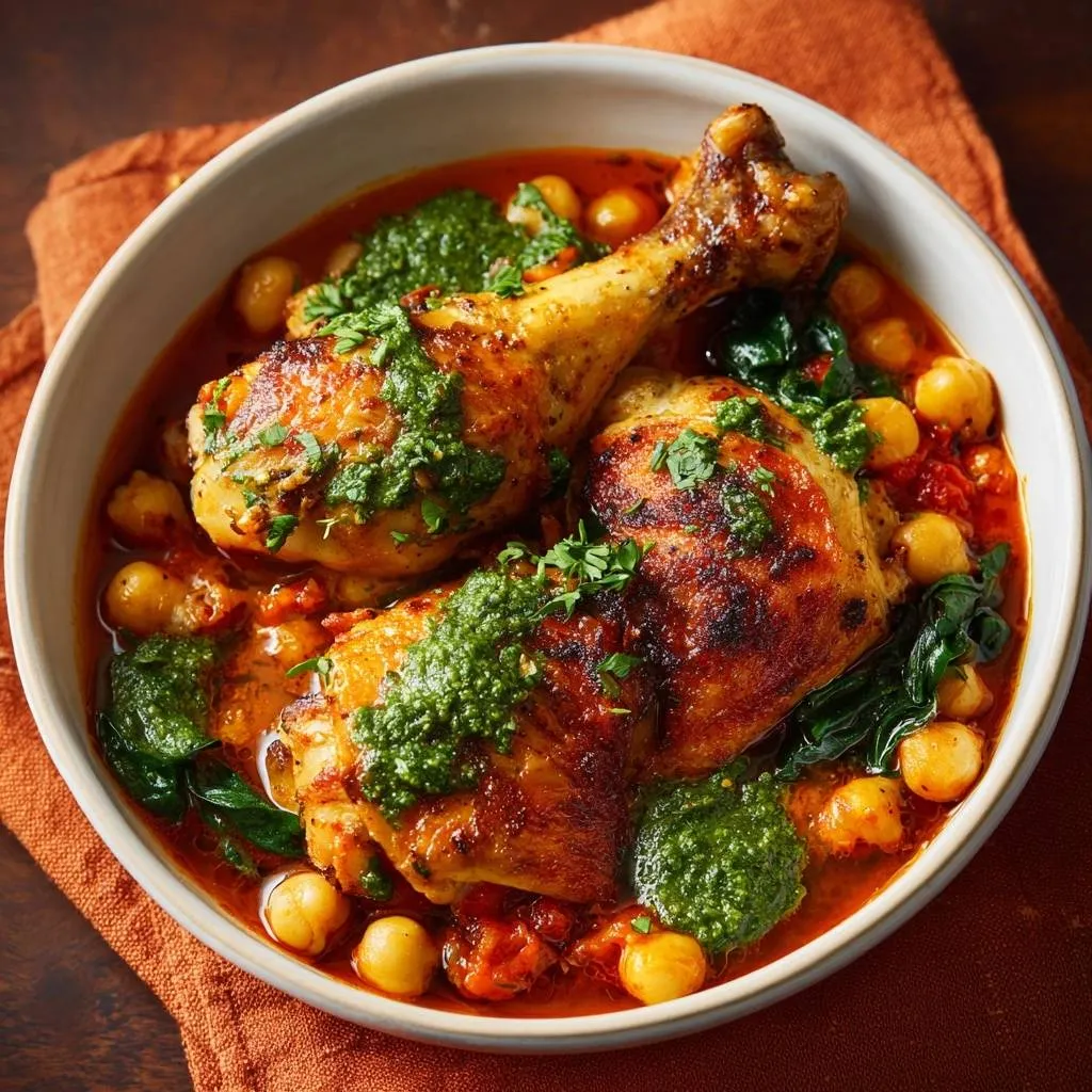 Learn the secret to braised chicken with shatteringly crisp skin. This one-pan Mediterranean dish features juicy chicken, fire-roasted tomatoes, and chickpeas.