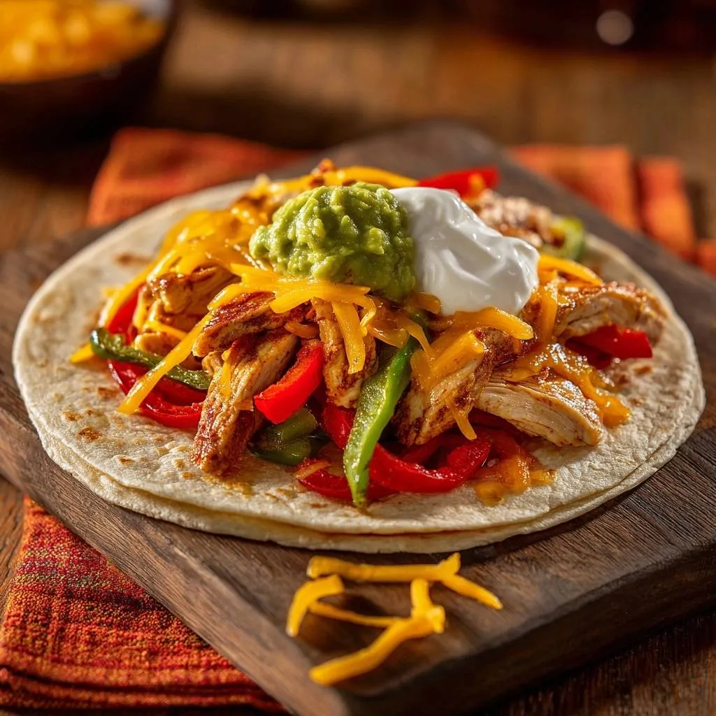 Tender, juicy chicken fajita tacos with high-heat sear method, crisp bell peppers, melty cheddar, guacamole, and sour cream.