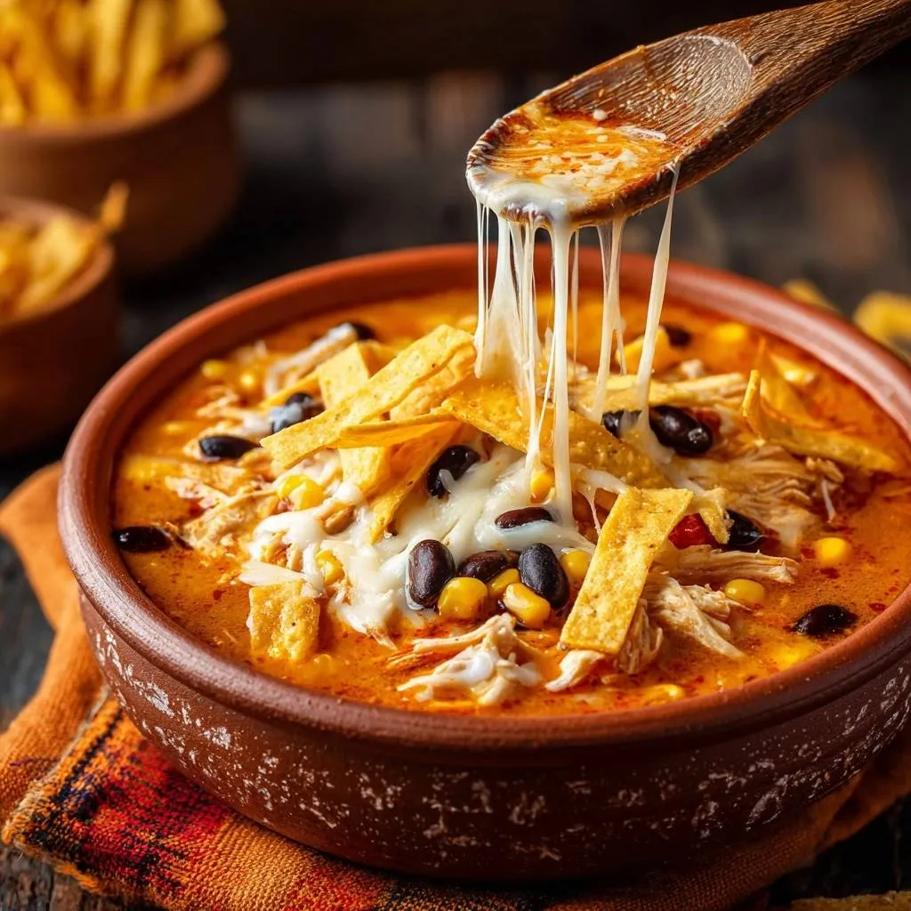A rich and velvety chicken tortilla soup that uses crushed tortilla chips and Monterey Jack cheese to create a thick, hearty base that is never watery.