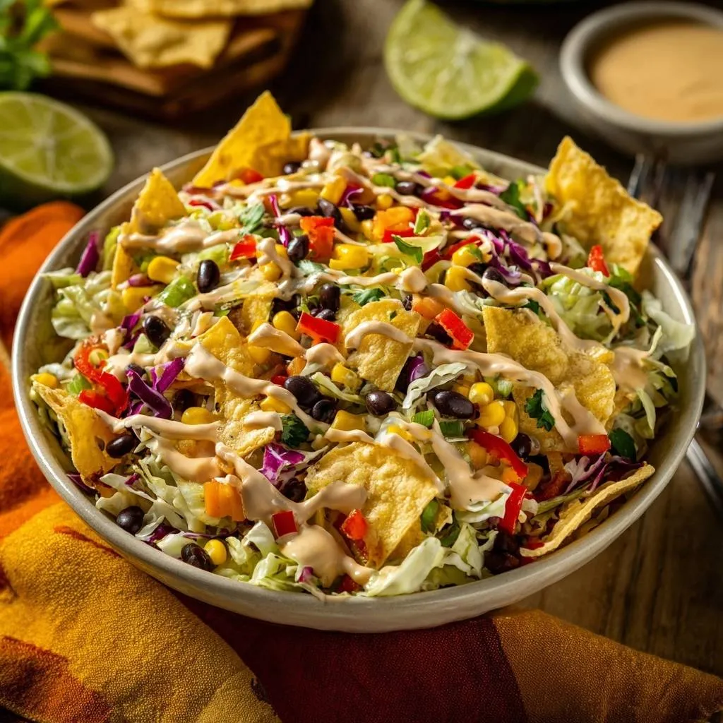 Crunchy taco slaw salad with fresh cabbage, beans, corn, and zesty lime crema. No soggy chips thanks to a simple layering trick. Perfect for potlucks!
