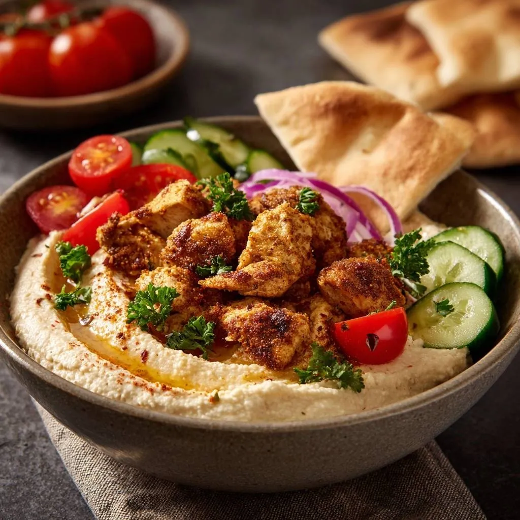 Juicy yogurt-marinated chicken with a crispy spice crust served over creamy hummus with fresh toppings and pita.