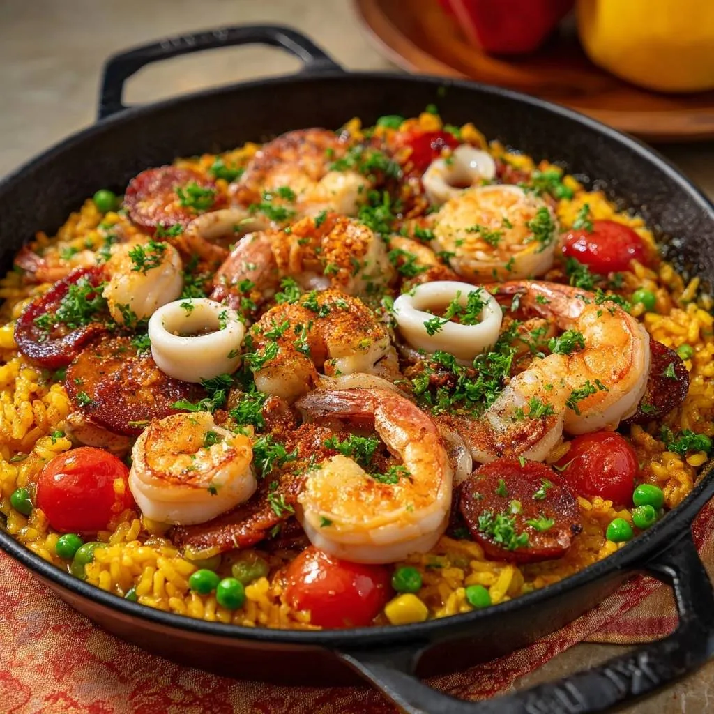 Authentic seafood paella with shrimp, calamari, chorizo, and a guaranteed crispy socarrat crust using a simple high-heat finish in a cast iron pan.