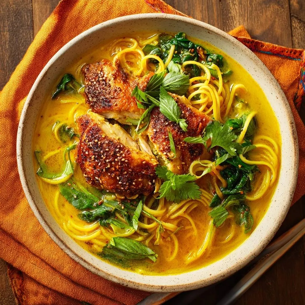 A rich and silky coconut curry noodle soup featuring a unique searing method to keep chicken skin shatteringly crisp even when served in broth.