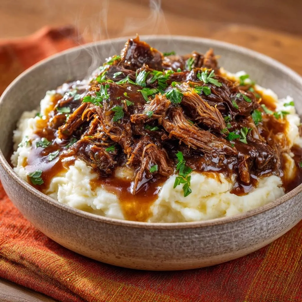 Tender Shredded Beef over Creamy Mashed Potatoes