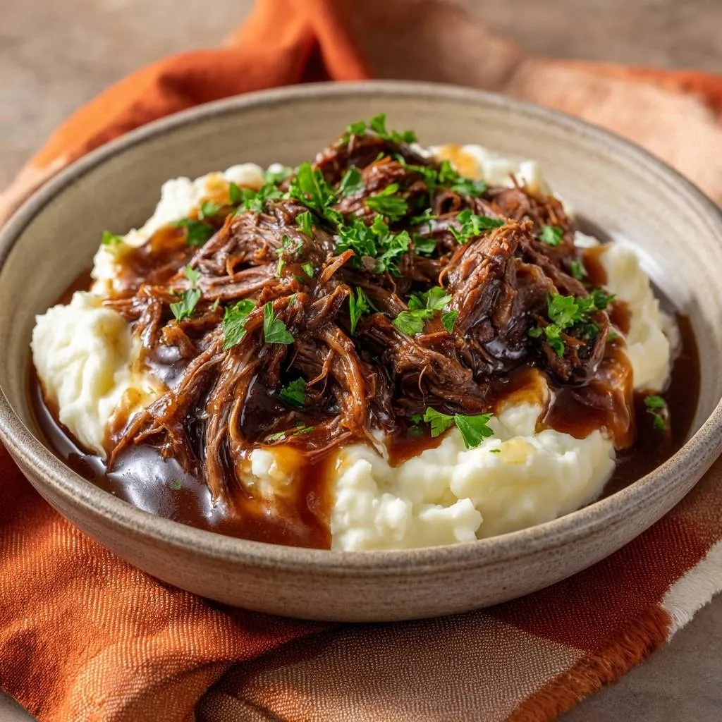 - Spoon mashed potatoes into bowls. Top with shredded beef, pour gravy over, and garnish with parsley. Serve hot for ultimate juicy comfort.