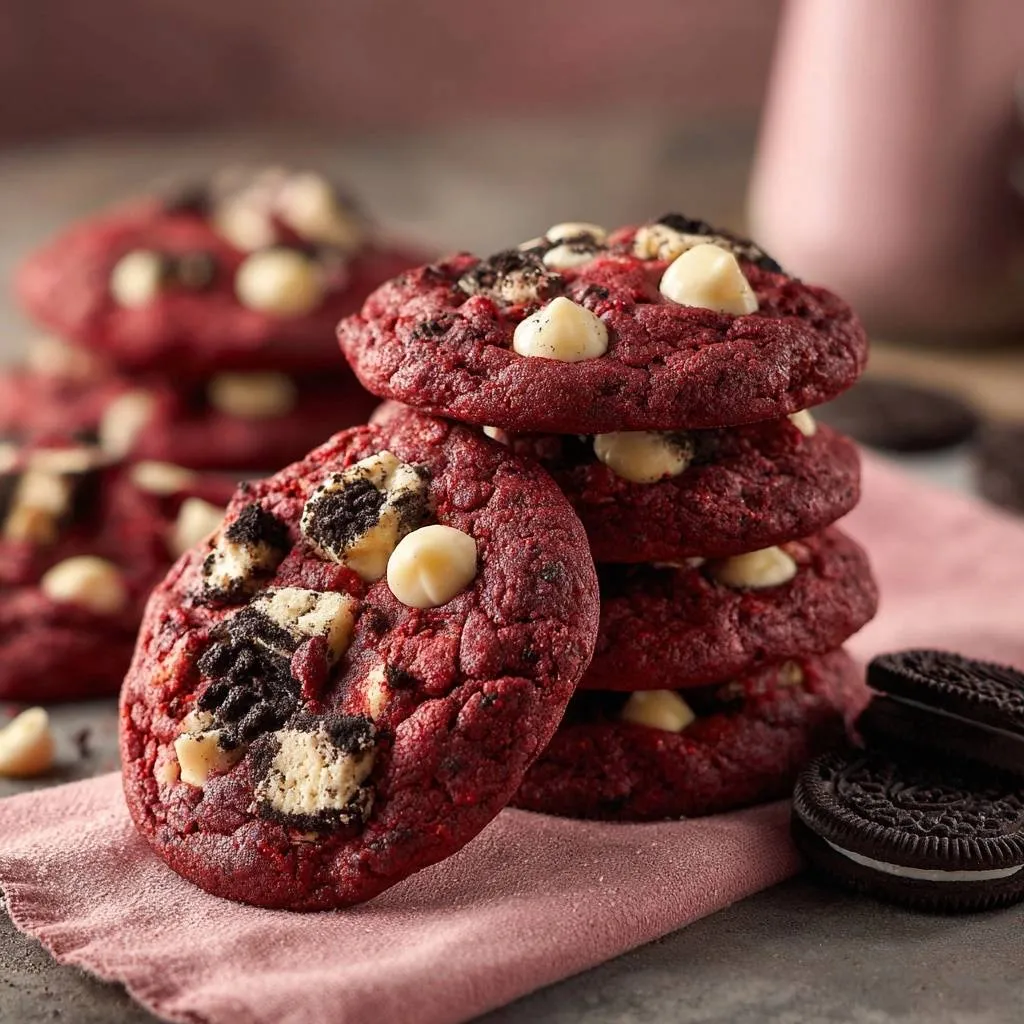 Therefore, you get tall, chewy stacks bursting with vibrant red color, crunchy Oreo bits, and melty white chocolate pockets. The contrast hits perfect: crisp edges give way to soft centers that pull apart just right. Oh man, that first bite crunches then melts, pure joy.