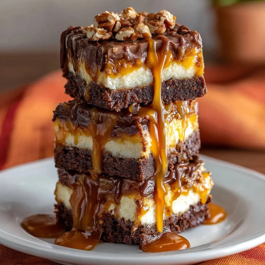 Why does this combo hit so hard? The brownie base delivers that dense, crackly-top chew you crave, while the cheesecake stays velvety without a single fissure. Then, the turtle magic seals the deal: gooey caramel oozes into every bite, pecans add nutty snap, and chocolate ties it all together. It’s indulgent heaven in bar form.