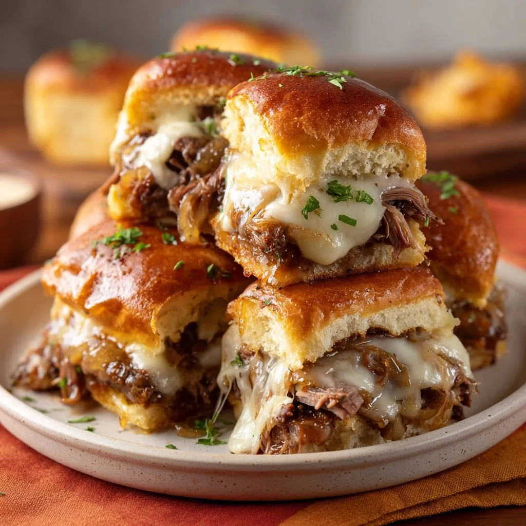Leftover assembled sliders are best stored in an airtight container in the refrigerator for up to 2-3 days. Reheat gently in the oven at a low temperature (around 250°F / 120°C) until warmed through, or microwave briefly. The au jus can be stored separately and reheated on the stovetop.