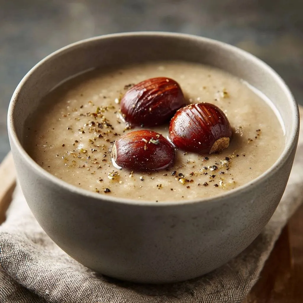 - Ladle into bowls. Top each with 3 whole roasted chestnuts and extra black pepper. Serve warm for cozy perfection.