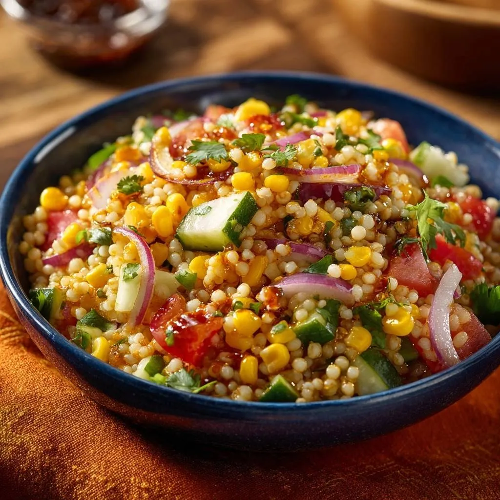Instant couscous works best here over pearl for quick fluff. Shop for peak-season veggies; they taste worlds better. No fresh corn? Frozen thawed kernels do fine, but pat dry first.